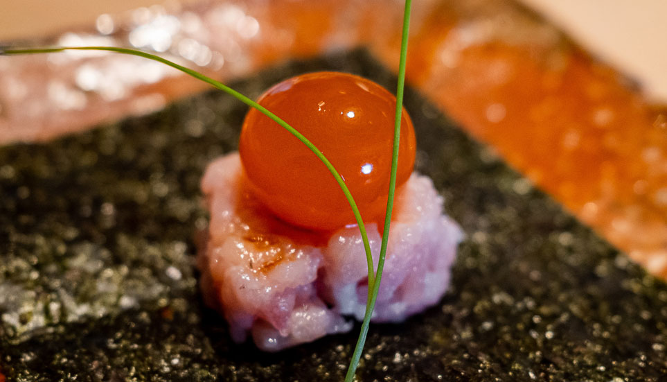 その日手に入る最高のマグロから3~4種類を厳選して仕入れ、その鮪をベースに全体のコースが毎日、組み立てられています。