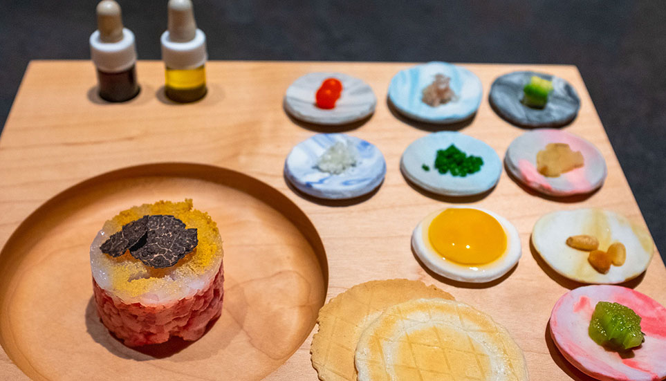 店内の温かみのある空間では、色彩や味わいの繊細さが印象に残る美しい料理がサーブされ、最先端の技術を駆使したフレンチと、浅草ならではのどこか人情味のある雰囲気とに、ある種のギャップ美が宿ります。この驚きと喜びこそが、「オマージュ」を象徴しています。